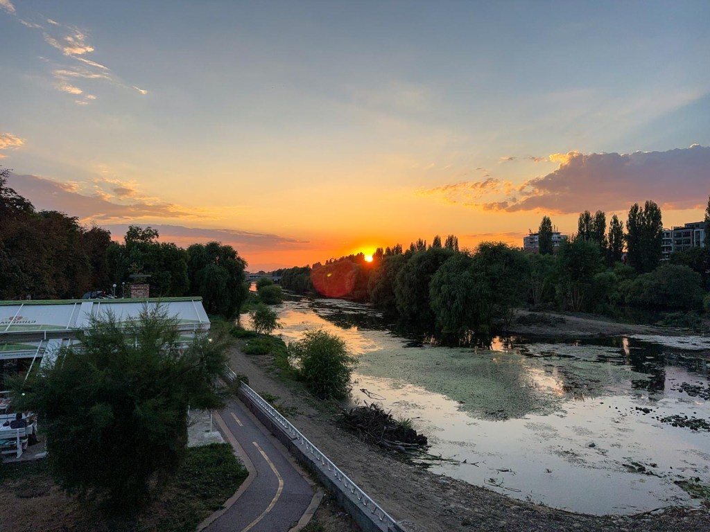 Packing is slow work with one hand. When we’ve packed as much as we can, we head out to the Happy Bar and Grill one last time. We walk back across the pedestrian bridge over the Maritsa river just as the sun is setting. It’s not the world’s most graceful river, but it almost looks charming tonight.