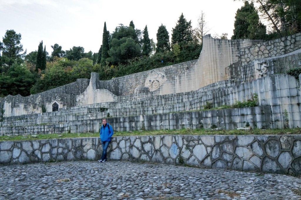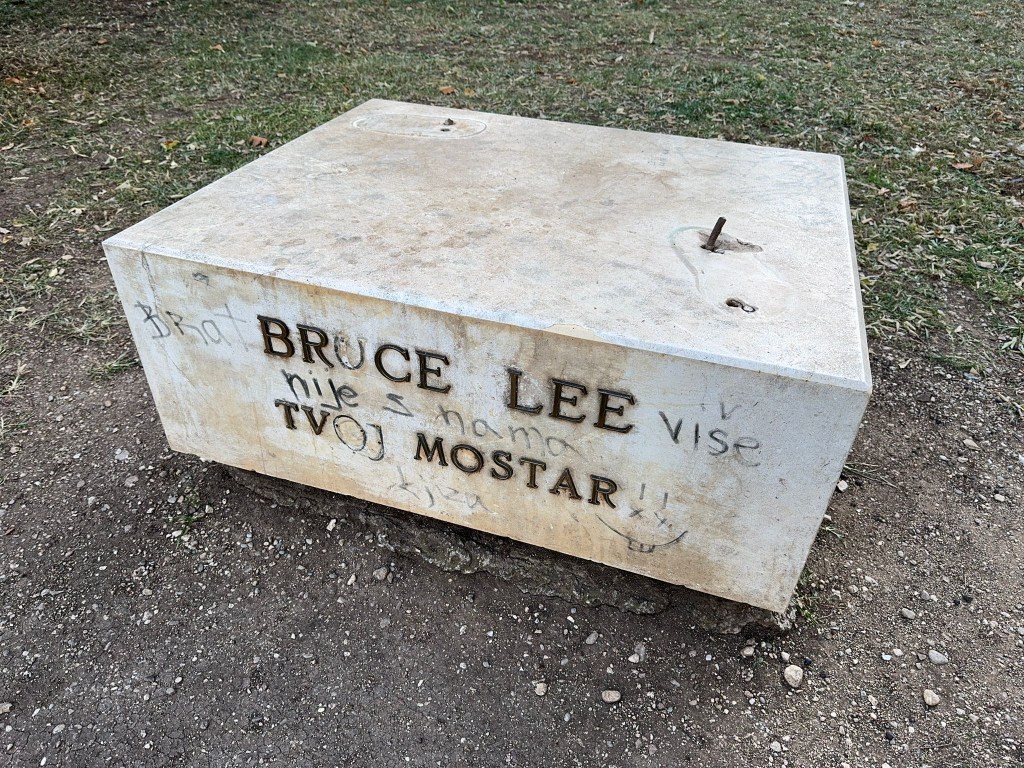 We plunge deep into the Croatian side of Mostar heading for the Partisan Memorial Cemetery, a surreal memorial/cemetery of crumbling stonework and puzzle-shaped headstones. On the way there, in Mostar’s main park, we stumble across the empty plinth of a statue of Bruce Lee. Curious as to where the statue went, we do a bit of Googling and find that it was stolen earlier this year and cut into sections to be sold as scrap, at which point the suspect was arrested.