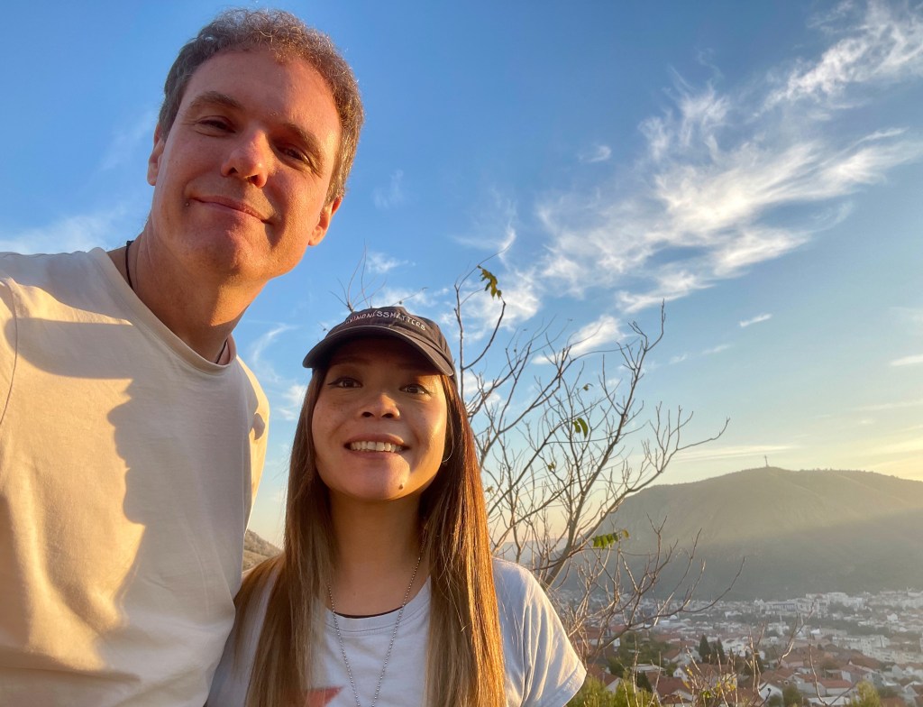 Before dropping us back in Mostar, Sanyel drives us up to the glass bridge viewing platform at the top of the hill overlooking the town. The sun is just about to set and we spend a magical few minutes peering down at the town and taking photos.