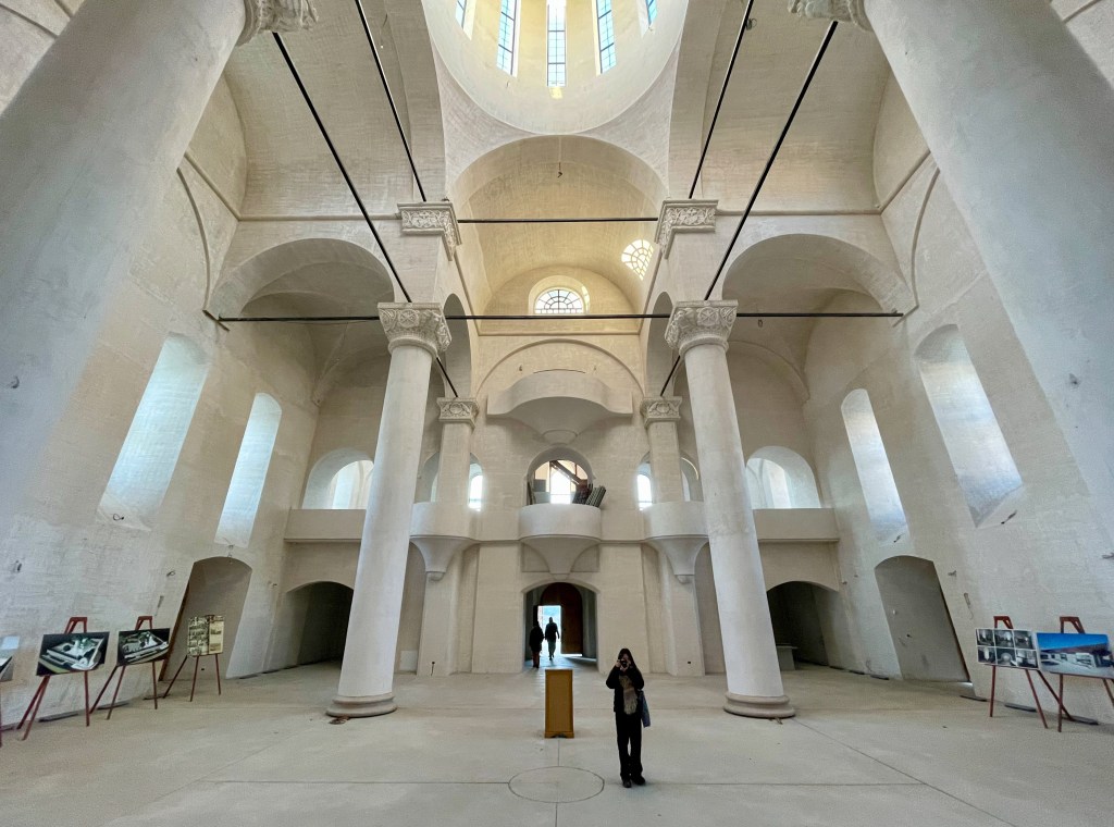 The sun’s back, but there’s a biting wind today as we walk up to the rebuilt Orthodox cathedral overlooking the town. On reaching it, we discover that it’s still under construction. I’ve never been in a church still being built. The construction itself is just about complete but the walls are waiting for paint, frescos, tiles or whatever is planned for them. The electric fittings are bare. And it’s empty save for an small exhibition of artist impressions of the finished cathedral and its outbuildings (if they’re ever finished – it’s only 3.30 on a Friday but no one’s working here today). A couple of other curious visitors arrive in the few minutes that we spend inside. They look as bemused as we do.
