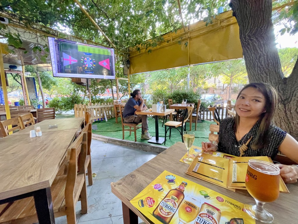 We take an evening stroll into town and find a rare licensed restaurant opposite the archeological museum. It’s pretty much an all-male hangout, but we feel comfortable. We’ll come back the next two nights for the Euro2024 quarterfinals.