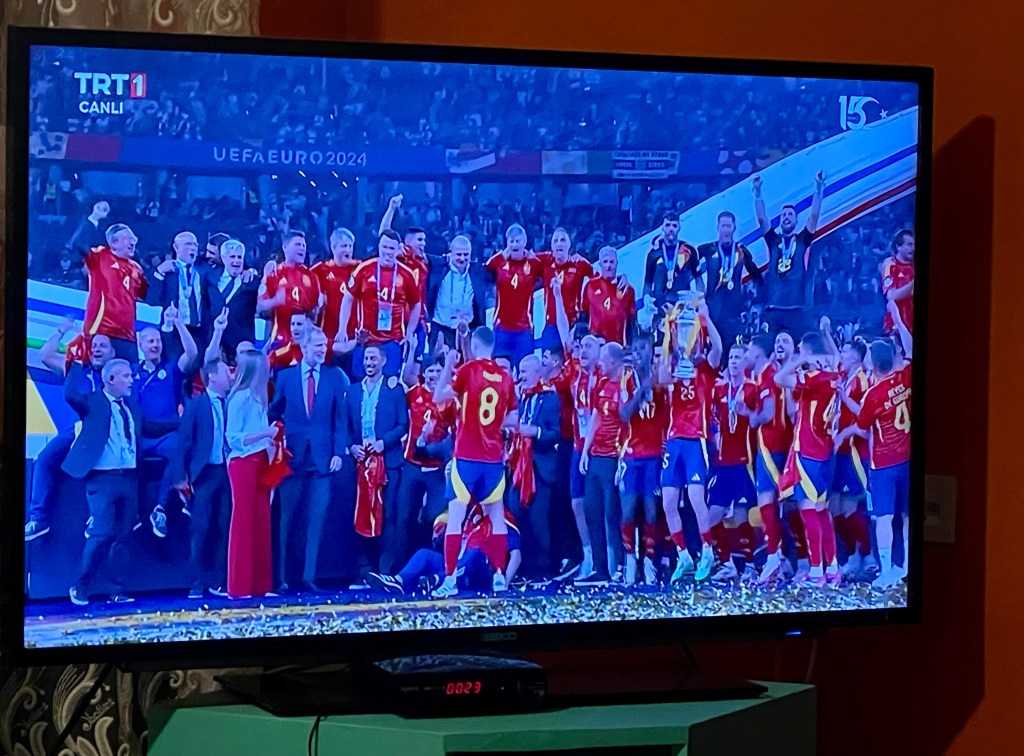 In the late evening, we all sit down to watch the first Euro2024 semi-final: Spain beat France 2-1. The night is hot: it’s our first night without air-con in Turkey – at least when we’ve needed it. (Our cave room in Cappadocia also had no air-con, but we really didn’t need it.) We won’t have the luxury of air-con again until we arrive in Plovdiv two weeks from now.