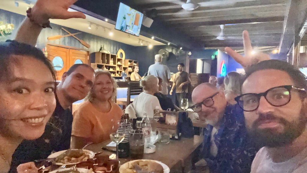Later, at Sam’s suggestion, we head back to the Jolly Fisherman (in a Grab – I’ll be drinking) to attend an inaugural information session for Samui expats. It draws a modest crowd, many of whom are representing the various services that the event has been convened to promote. Our walkaway is that we really should get ourselves vaccinated against dengue fever next time we come.