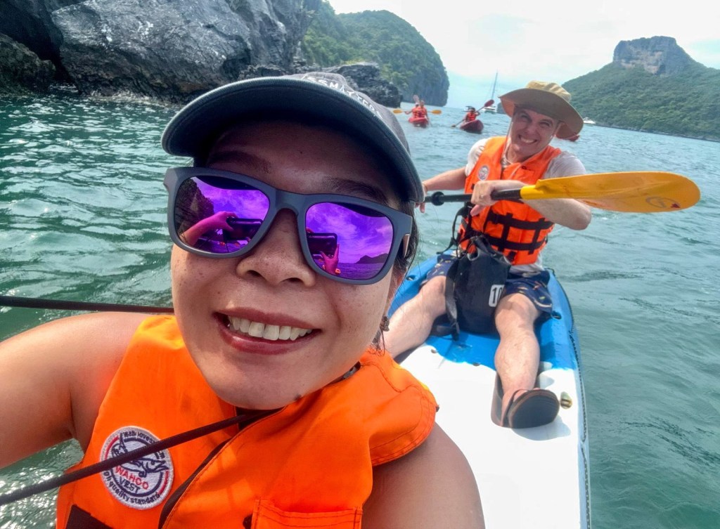 We join a boat tour of Mu Ko Ang Thong National Marine Park. It’s an early start and a long day, but it’s good to be back on a boat for the first time in many months. The tour is a bit of a production line: there must be at least 100 of us on the boat. Most are farangs, but we’re picked up with and find ourselves sitting next to, a local family of three in matching rainbow-coloured tie-dyed t-shirts. Unfortunately, the impersonal nature of such a large group doesn’t make the day very conductive to chatting to our fellow daytrippers.