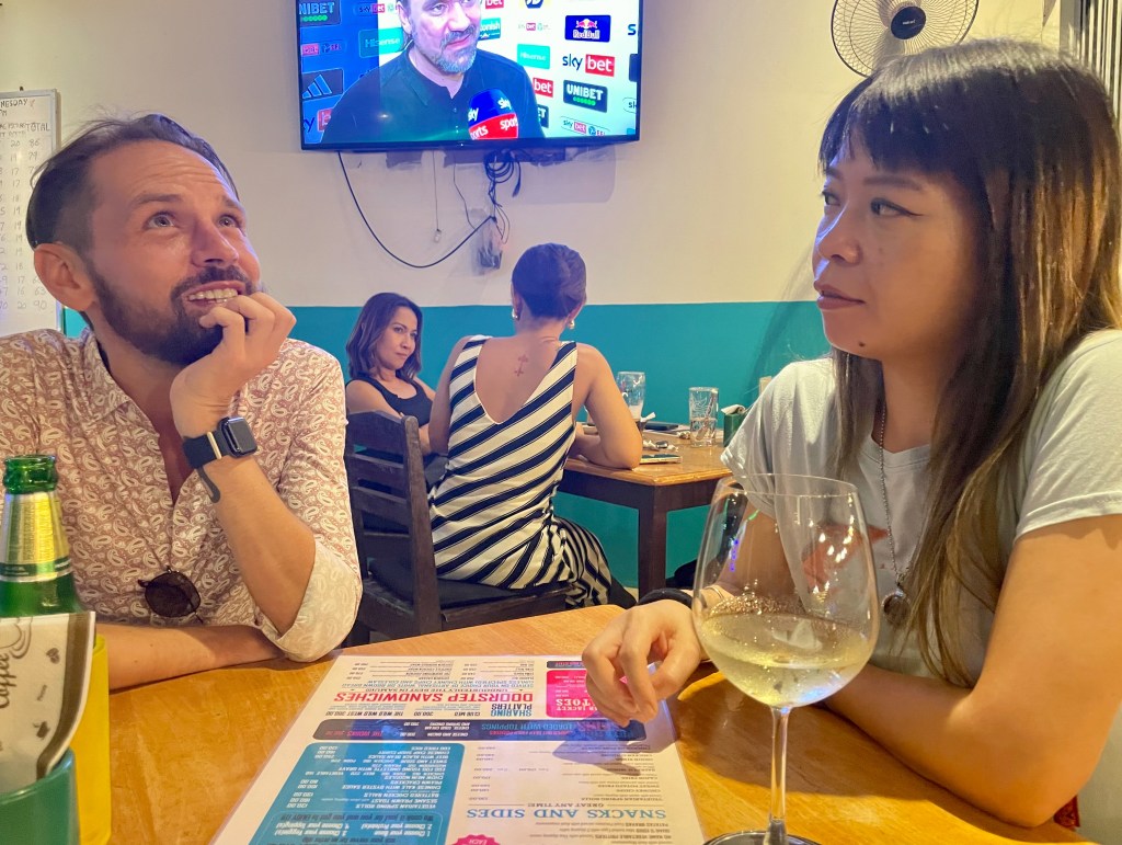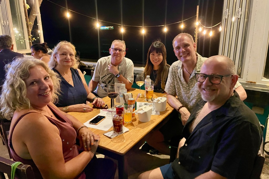 At sunset, we meet up with Sam and Clare Furness at a rickety bar on the far side of the airport, near their home (Jason’s currently working in HK). It’s good to see them. Sam looks very thin. He later explains this is due to being prescribed medicine for his recently-diagnosed diabetes that contained Ozempic, that wonder weight-loss drug. Apparently, he went from 80 kilos to just under 50 kilos before he discovered that he’d been prescribed completely inappropriate medication. He’s now recovered to 60 kilos, but still looks slight for a man of five foot six.