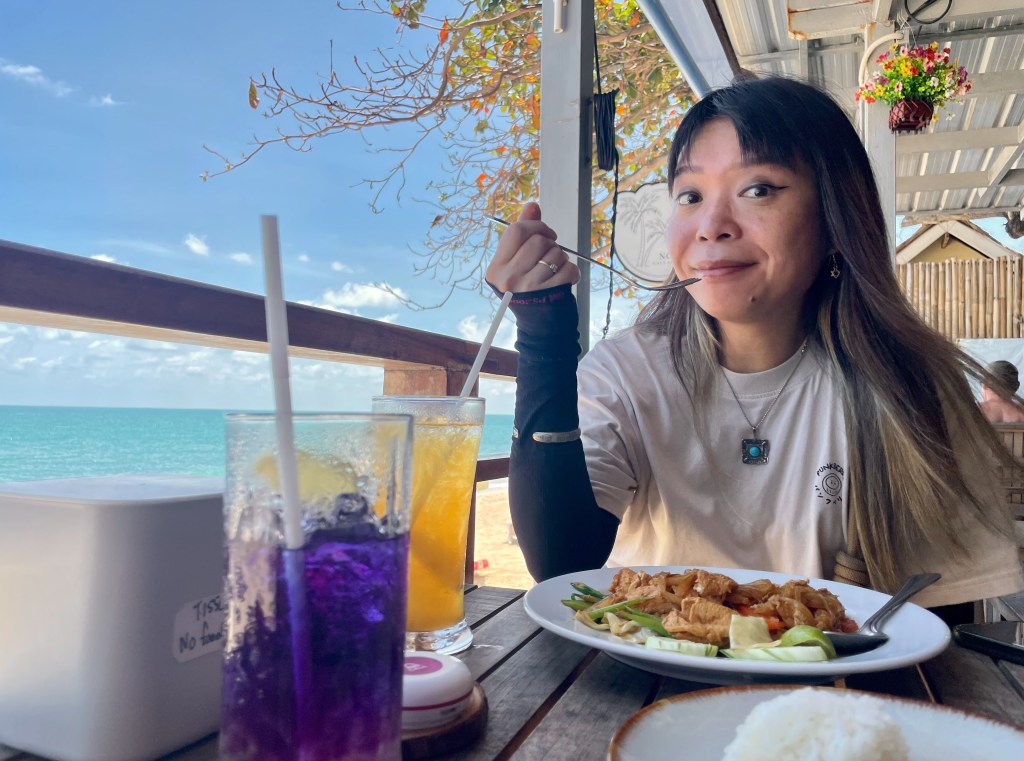 For our final afternoon, we head to Chaweng beach. Our Grab driver is a 20-something lady with cropped hair and – by contemporary standards – a modest number of rather elegant tattoos. When I tell her that she doesn’t need to drop us off exactly where we specified as long as we can access the beach, she drops us at a ghastly beach club that’s playing deafening trance ‘music’ at three o’clock in the afternoon.
