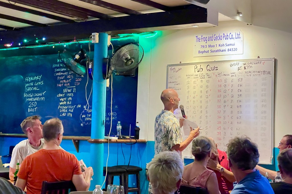 In the evening, we meet up with Sam at The Jolly Fisherman bar, which is running its regular Tuesday night quiz. Sam introduces us to his teammates Carol and Lester from Southgate, north London, a lovely couple in their sixties who have recently moved to Ko Samui. Throughout the quiz, we pepper them with questions about living in Samui. Quizmaster Matt is desperately incompetent, with poorly thought-out questions and an unnecessarily convoluted scoring system. But, hey, we win the quiz.
