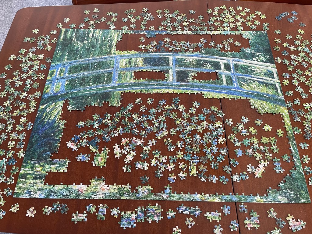 Back at the house, we fall into conversation about Roger’s illness and passing. I’m glad the conversation came naturally and easily. Sue’s still understandably wobbly at times as we talk, but she clearly wants to talk and I want to listen. After dinner, we go through Sue’s box of vinyl, which is more-or-less unchanged since the late 1970s. I could name half the albums in that box without even seeing them. Unfortunately, the record player doesn’t work, so we play Regatta de Blanc and Out of the Blue on iTunes as we settle in to work on the world’s hardest ever jigsaw, which Sue’s already been working on since January.