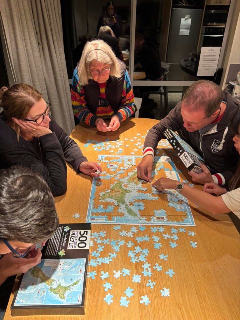 It’s Claire and Taylor’s turn to cook tonight. They effortlessly rise to the challenge, turning out roasted sweet potatoes and carrots, kofte, and a side salad of baby spinach and tomatoes. After dinner, we spend the rest of the evening doing a sort of JigMap of New Zealand.