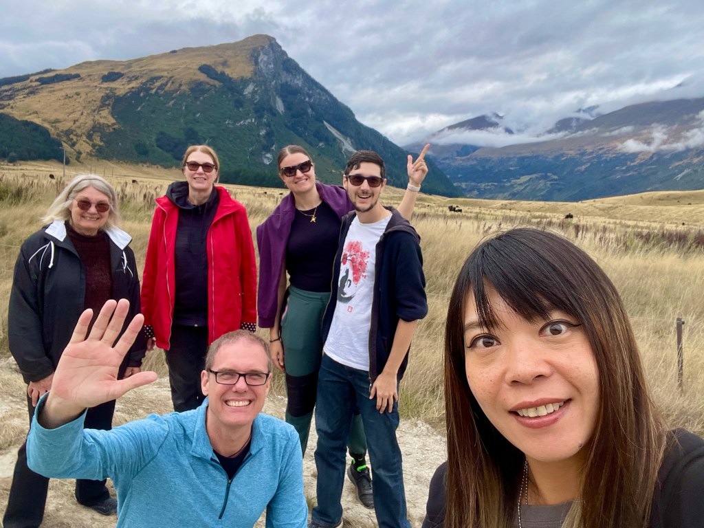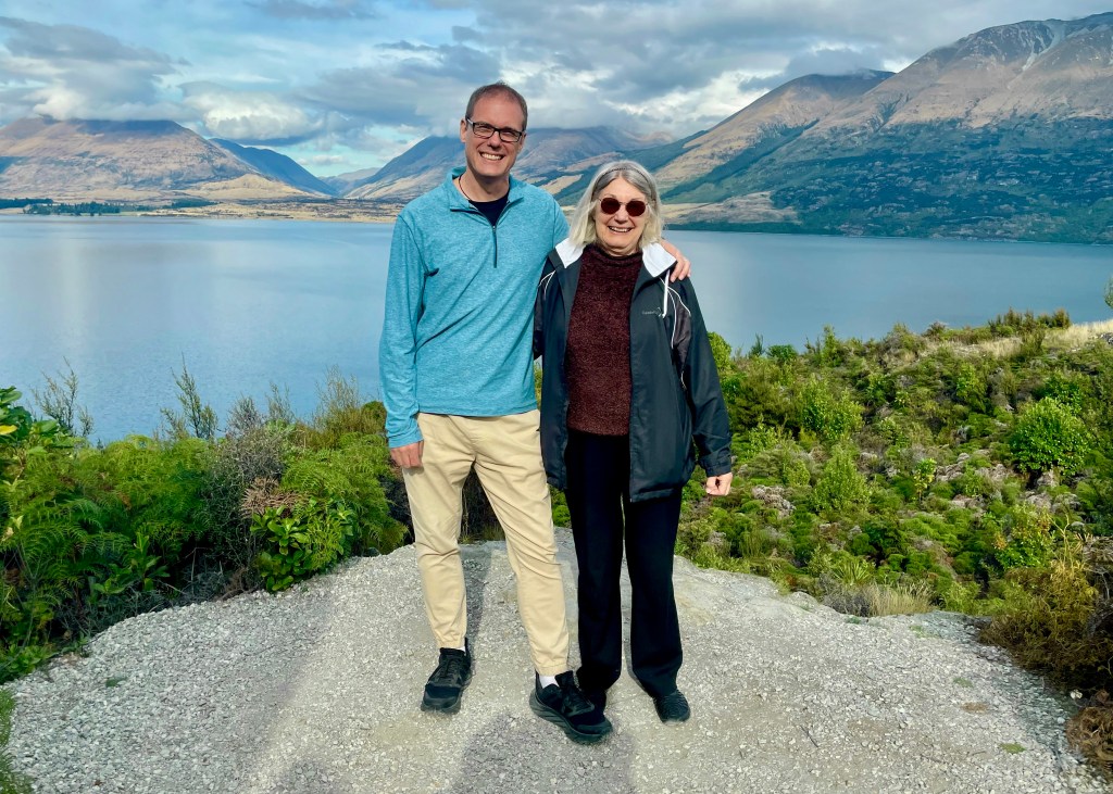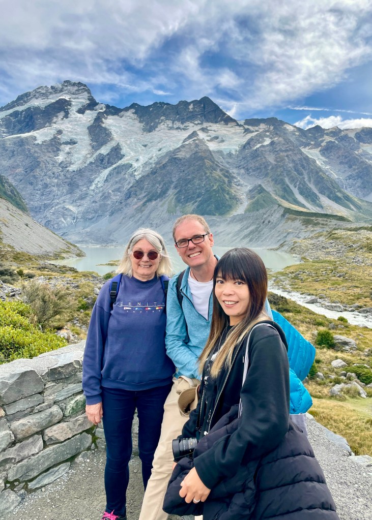 Today is our capstone day in New Zealand as we walk the Hooker Valley Trail to the foot of Mount Cook. We decide to break into two groups: the two of us with mum, and Sue with Claire and Taylor. Given that hiking in a group of six can be like herding cats, this works out just right. It’s a mostly gentle 5km stroll to a glacial lake that marks the end of the trail, and where Sue, Claire and Taylor are waiting for us before they head back to the trailhead. On the way, we cross three narrow suspension bridges over roaring rapids. Mum manages the outward walk seemingly effortlessly, but understandably begins to flag on the return leg. By the time we arrive back at the trailhead, she’s exhausted. Still, all six of us are thrilled to have got so close to the stately Mount Cook. It occurs to me that I haven’t been in scenery like this since my post-school trip to the Alps in the summer of 1984.