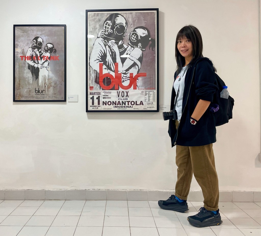 K’s keen to see a Banksy exhibition nearby. It costs us four times as much as the National Museum and, in my view, offers thin returns. I suspect I’m just getting a bit long in the tooth to appreciate guerilla artists like Banksy. Still, there’s an opportunity for a photo with Blur’s ‘Think Tank’ artwork.