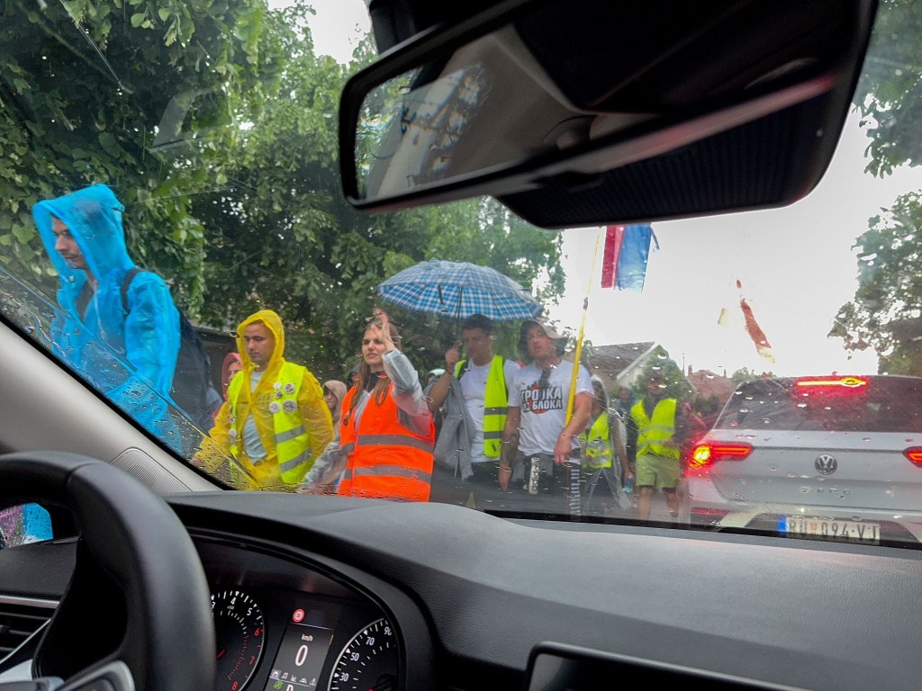 Before long, the rain starts, gentle at first but ever heavier. As we loop around Frusca Gora, we pass through the small towns of Indija, Putinci, Ruma and Irig. In Irig, several hundred wet people accompanied by a police escort are marching in the rain to protest the current Serbian government. Despite the rain, it’s good natured and we wave as they pass: