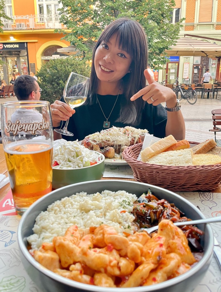 The sun’s about to set, so we find a bustling restaurant serving Balkan food with plenty of street seating in a quiet backstreet and tuck in.