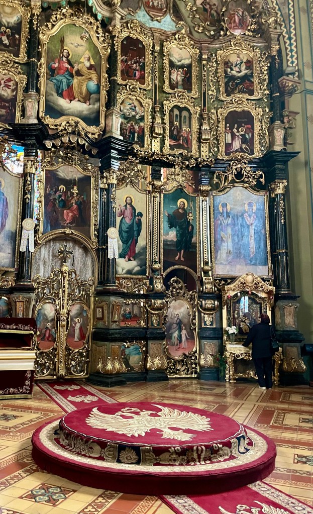 Back in the town square, we slip into a now almost empty St Nicholas Cathedral. The rococo alter is a full blast of Balkan bling: