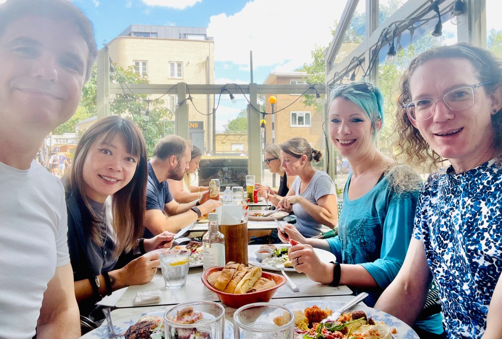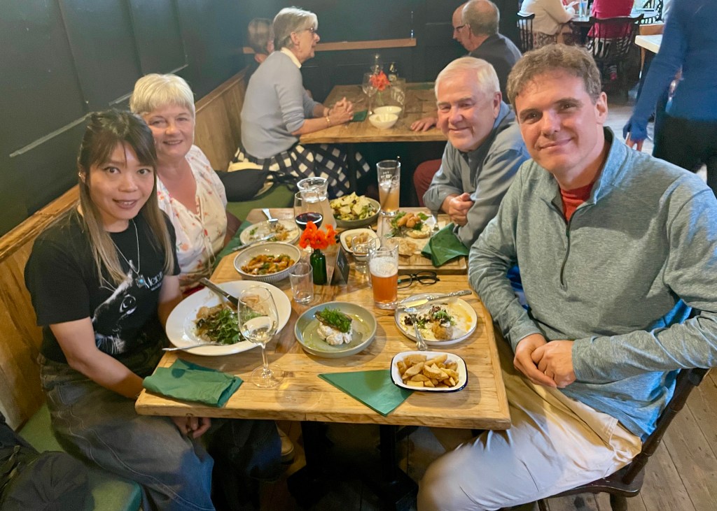 Back at Karen and Lee’s, we tuck into baked salmon, roast potatoes, ratatouille and green veggies, and talk late into the evening about family, travel, and the dire state of British politics.