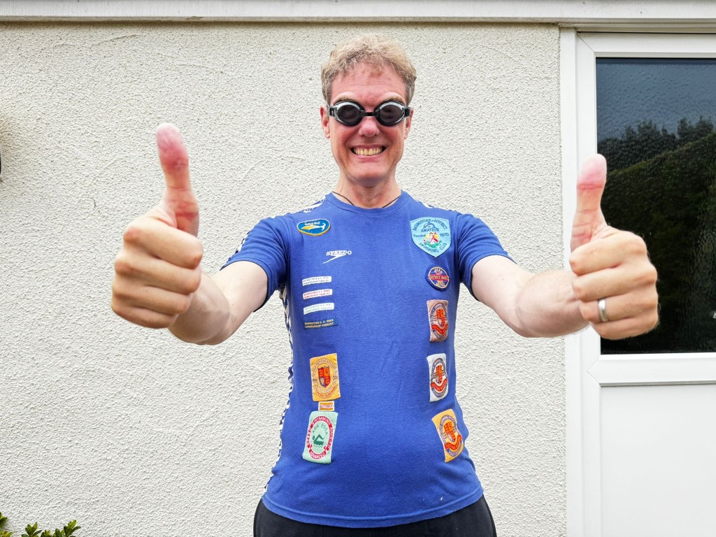 While mum pauses to hang out some laundry, I rummage around in the two trunks that I still have in the loft. I chance upon my old poolside swimming top with my old speed award patches. I toss it down onto the hall carpet and, when I’ve finished clearing out the junk, try it on. Miraculously, it still more-or-less fits: