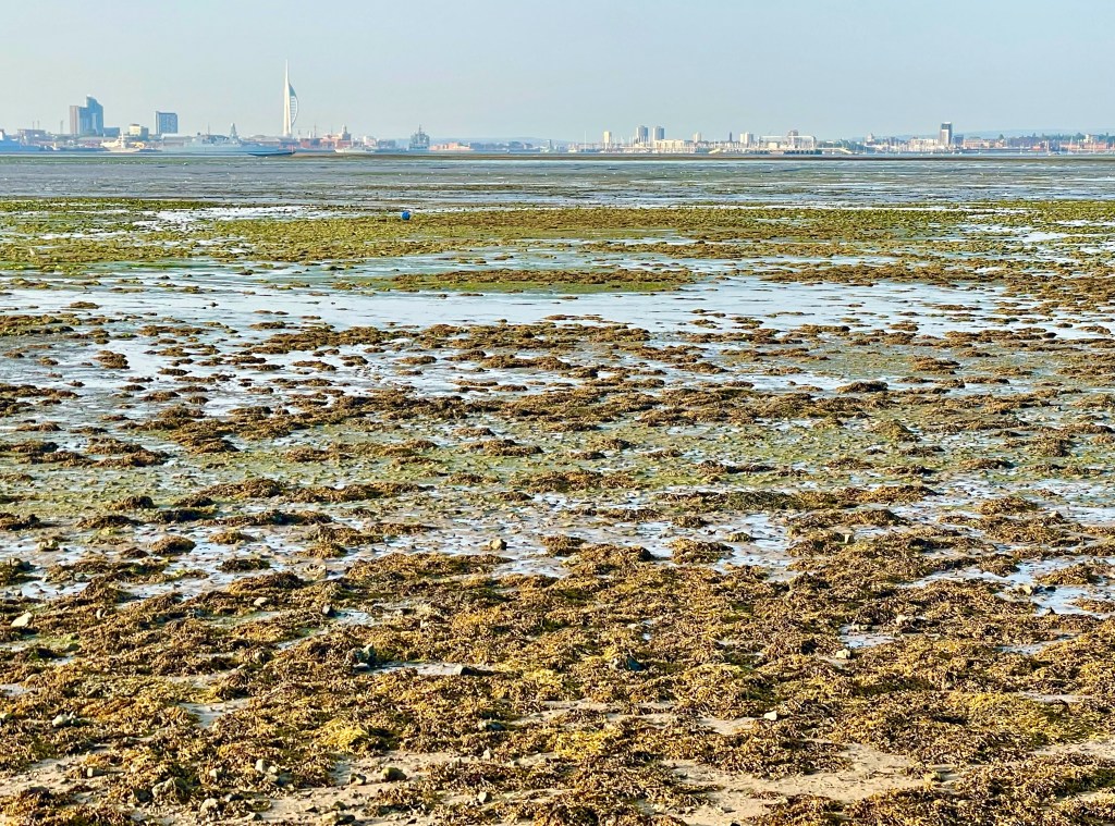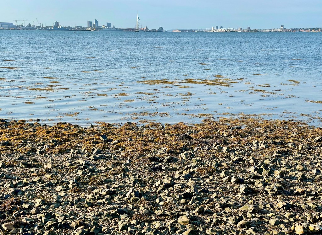 For the first time since arriving in Portchester, my morning walk to the castle and back coincides more-or-less with high tide. Although there’s more colour when the tide’s out as the harbour floor stretches away in multiple shades of seaweed green, mud brown, and pebble grey, the harbour still looks altogether grander when it’s full of water: