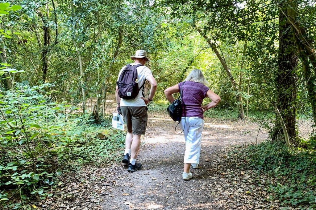 In the late afternoon, the three of us drive a few miles to Whiteley, where we manage a shaded stroll in woodland to get in some steps: