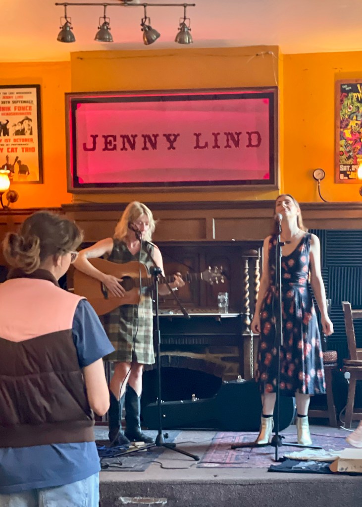 As we arrive, the host, a Jason McNiff, kicks off with a few choice covers on an amped acoustic guitar, joined by a mandolin player who reminds me of 10,000 Maniacs’ Robert Buck—had he lived to 60 instead of drinking himself into an early grave. Jason himself, in black drainpipes, embroidered Western shirt, winklepickers, and sporting a mass of unkempt strawberry blond hair, reminds me of Julian Cope. He’s charismatic, but humble and gracious when he speaks, lacking any air of pretense. We catch only four songs, but among them are the Flying Burrito Brothers’ Sin City and an acoustic take on the Byrds’ electric arrangement of My Back Pages. He bows out and hands us over to local Americana artist, Hayley Savage.