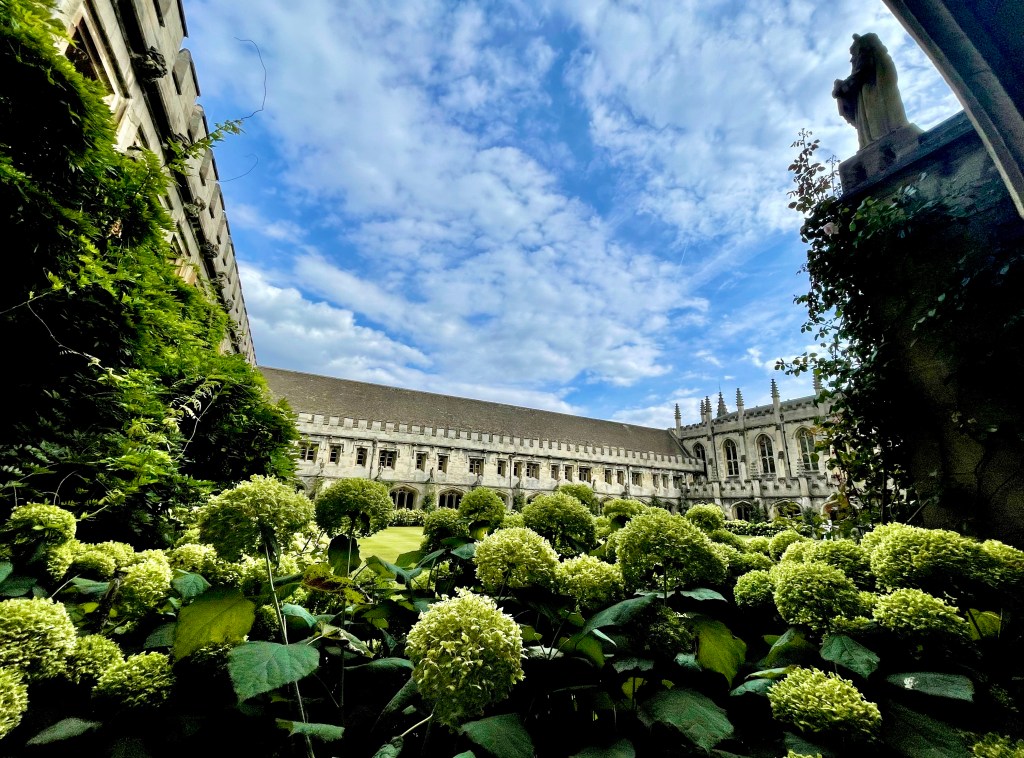 It’s a perfect afternoon for a stroll. At mum’s last week, I opened my thirty-year-old Rough Guide to England (still in the dining area bookcase!) and read up on Oxford. Addison’s Walk, a picturesque footpath around a small island in the River Cherwell in the grounds of Magdelen College, caught my eye—and it’s only a few minutes’ from our Airbnb. There’s a charge to access the college, but it’s worth it many times over. To reach Addison’s Walk, we pass through the college cloister, marvel at the trim lawns and gardens of hydrangeas, and soak in the rarified atmosphere on one of Oxford University’s wealthiest colleges: