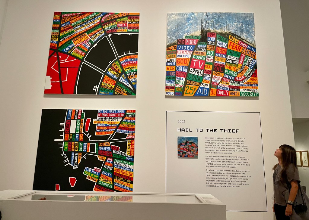 Todaywe do what we came to Oxford to do: visit the Stanley Donwood/Thom Yorke exhibition of Radiohead and related cover art at the Ashmolean. It turns out to be considerably more engaging than I’d anticipated. There are discarded alternative designs that never saw the light of day, huge original paintings that were only later used or amalgamated into album covers, and the inevitable notebooks containing the first stirrings of the lyrics to songs that would go on to become classics. We did well to pivot and come to Oxford.