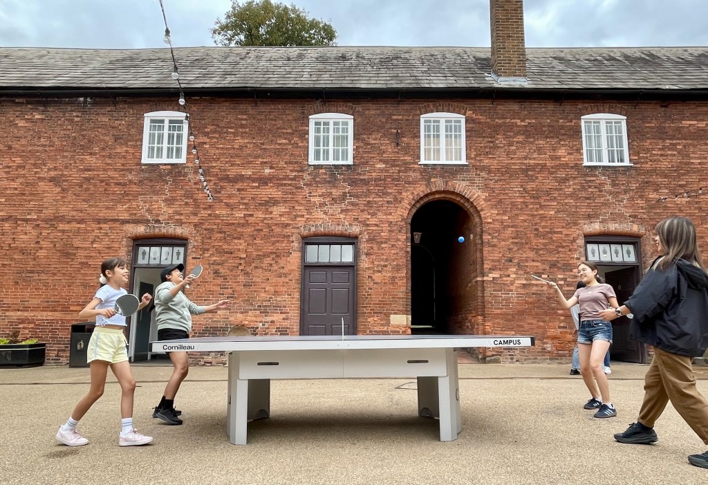 Rain is looming, but before we leave Woolaton Park, we need a photo op. In the courtyard of the museum, we find a table tennis table with bats and balls. There’s just time for a quick match before rain stops play and we all retreat under umbrellas to Ashchurch Drive for afternoon tea and cake, and to follow the Saturday afternoon football scores.