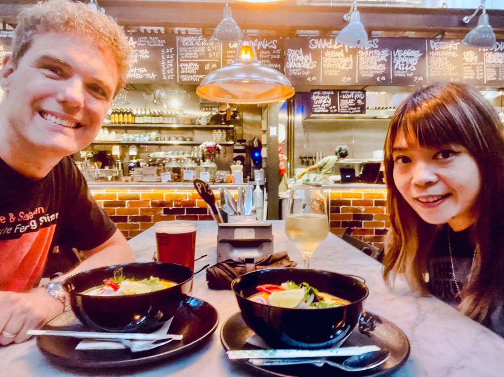 Percy’s happy to see us when we get back. We seem to be building trust. Later, we feel comfortable enough to leave him again for a short time to venture out for our regular Wednesday night meal. The Picturedrome is an old art-deco cinema that’s been converted into a hip foodhall. While other restaurants in Macclesfield are almost empty, the Picturedrome is buzzing with customers—and it’s only Wednesday night. It’s clearly doing well. We both order a bowl of khao soi chicken and an adult refreshment, and tuck in.