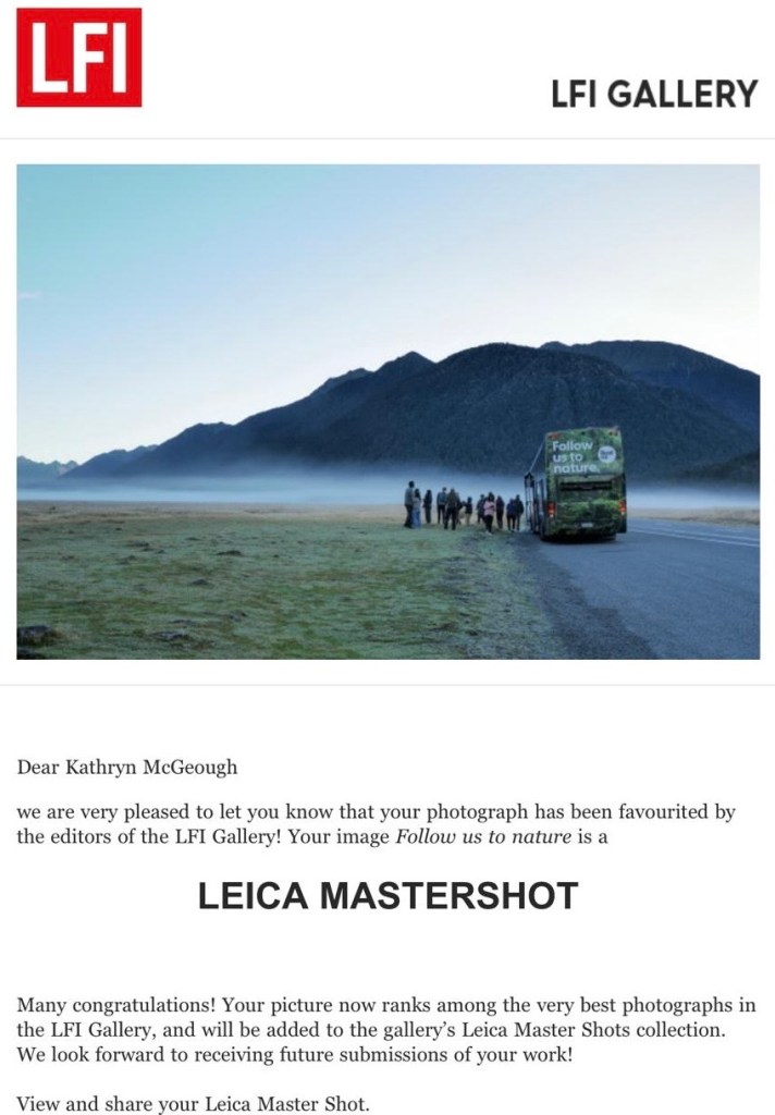 On a brighter note, K receives a message from the good people at Leica informing her that her photo of a group of tourists on their way to Milford Sound earlier this year has been selected as a master photo for inclusion in the Leica Master Shots collection: