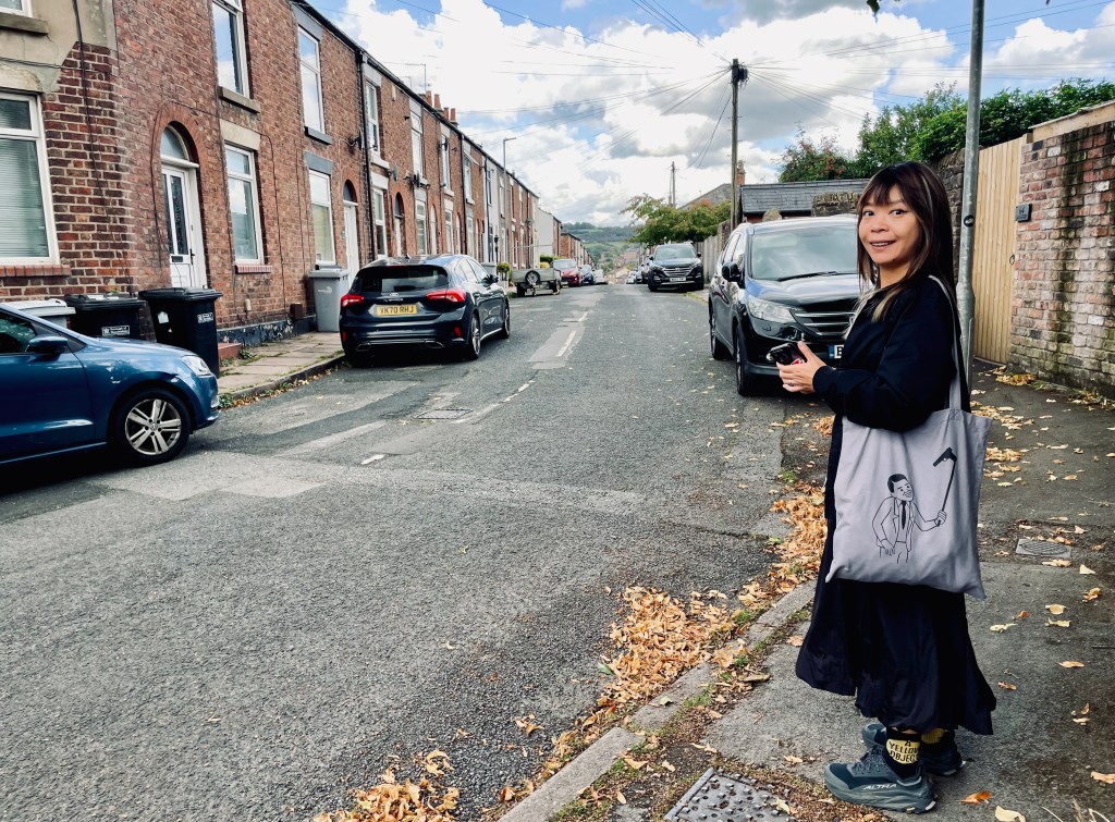 Our reverie is broken when a shadow falls over the park. Looking up, we see an ominous grey sheet of cloud drifting towards us. We retrace our steps, past Ian Curtis’ house (there’s no one around now—we stop for a quick documentary photo), and back towards Macclesfield town centre.