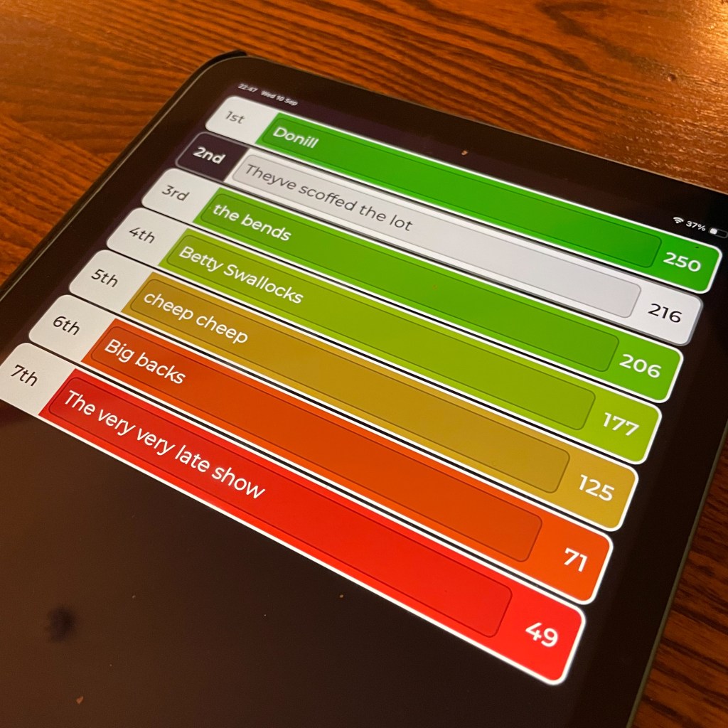 It’s our first Speedquiz anywhere but Lamma. The Speedquiz app on my iPad still has us registered as ‘They’ve scoffed the lot!’, which goes down well with tonight’s Quizmaster. Jimmy B, as he styles himself, is excellent. A George Best lookalike in his 30s, he keeps everyone involved, interacting with every team, and updating us on the scores every few minutes. He also throws in a few bells and whistles that Adam, perhaps wisely, chose not to include in his Lamma Speedquizzes. These mostly involve the leading team having to answer (and losing points if they’re wrong). If either of the bottom two teams are fastest to answer correctly, they get to ‘spin the wheel’: a screen-based one-armed bandit that presents snakes-and-ladders style consequences, from being rocketed into first place to forfeiting thirty points.