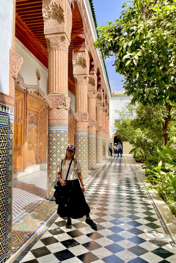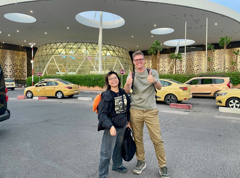 I only pull it back up as we prepare for landing. The harsh landscape looks even more ominous as Marrakesh is shrouded in patches of thick rain cloud. We navigate the architectually stunning airport smoothly, picking up SIM cards and local currency from an ATM that, according to online chat, doesn’t charge exorbiant fees. Our (English-speaking) driver is outside to greet us and drive us to Riad Amina.