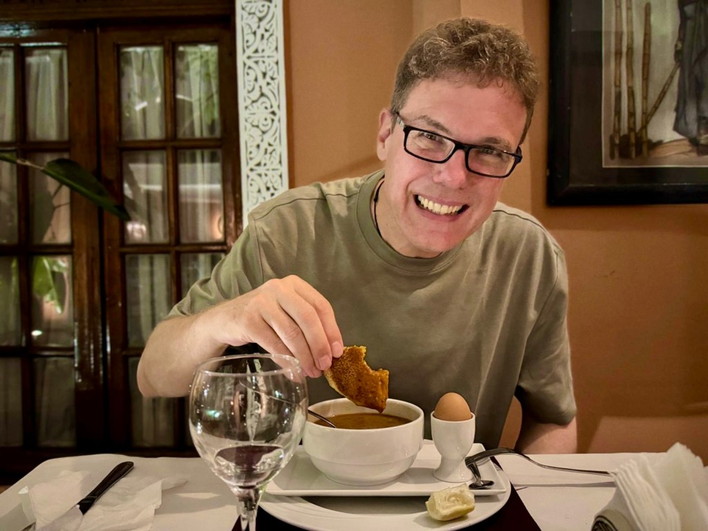 Day 2 in Marrakesh. Once again, it’s late morning before we’re ready to step out from the tranquility of Riad Amina. We dive into the chaotic medina, soon stopping for a lunch of gazpacho (Andalusian, not Moroccan) at another tiny rooftop restaurant. We’re under a sun umbrella, but when the sun comes out (it’s been overcast and damp all morning), my head is slightly exposed. Rather than do the sensible thing and slip on my hat, I stick it out because we’ve almost finished lunch. I’ll regret this later in the day.