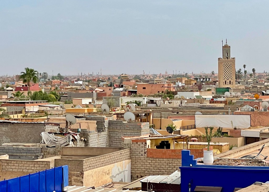After a pitstop for coffee, we retrace our steps to Riad Amina to relax until we feel hungry enough to step out for dinner. Like yesterday when we arrived, the air is thick and heavy with imminent rain. Earlier we spotted another tiny upstairs restaurant not far from our riad. We find it and climb two floors to the covered rooftop terrace. Once again, we’re the only customers. A stiff breeze is blowing as dusk falls on Marrakesh. The terrace lamps are swinging wildly as spots of rain fleck our faces and bright bursts of lightning race across the sky to the south. Eventually, the rain can hold off no longer and we’re forced to retreat to the ground floor to eat. The food is simple and hearty. By the time we’re ready to leave, the storm has passed and the flagstones in the lane outside are already dry. We head back to Riad Amina. Day 1 in Morocco has gone very well indeed.
