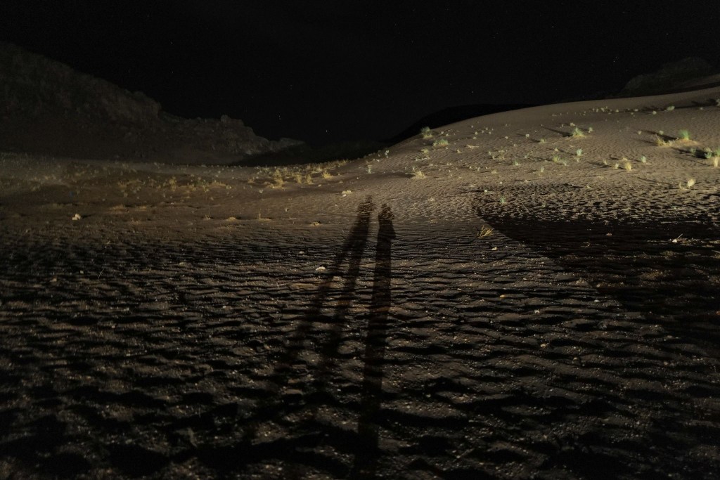 We’re up at dawn to climb a low sandy ridge close to the camp to watch the sun rise over the desert. Unfortunately, K and I have a misunderstanding about how long she’ll need to get ready, so I initially climb up alone and find a spot for us on a low rock among the other dawn chasers. I partly descend again to help K up the last stretch. She’s the last one to reach the top for sunrise, tired, thirsty and grumpy.