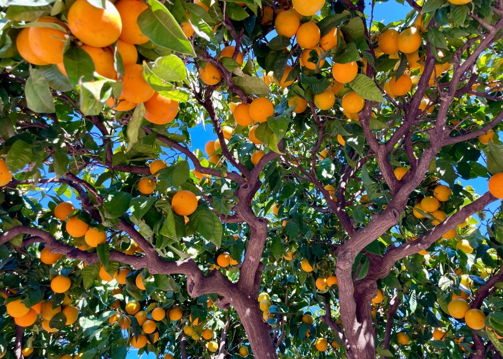 The orange trees are heaving with ripe fruit. I’m used to seeing bananas, mangos, and even passion fruit ripe and ready to pick, yet seeing the streets lined with ripe oranges seems strangely exotic. I wonder why no one has picked them?