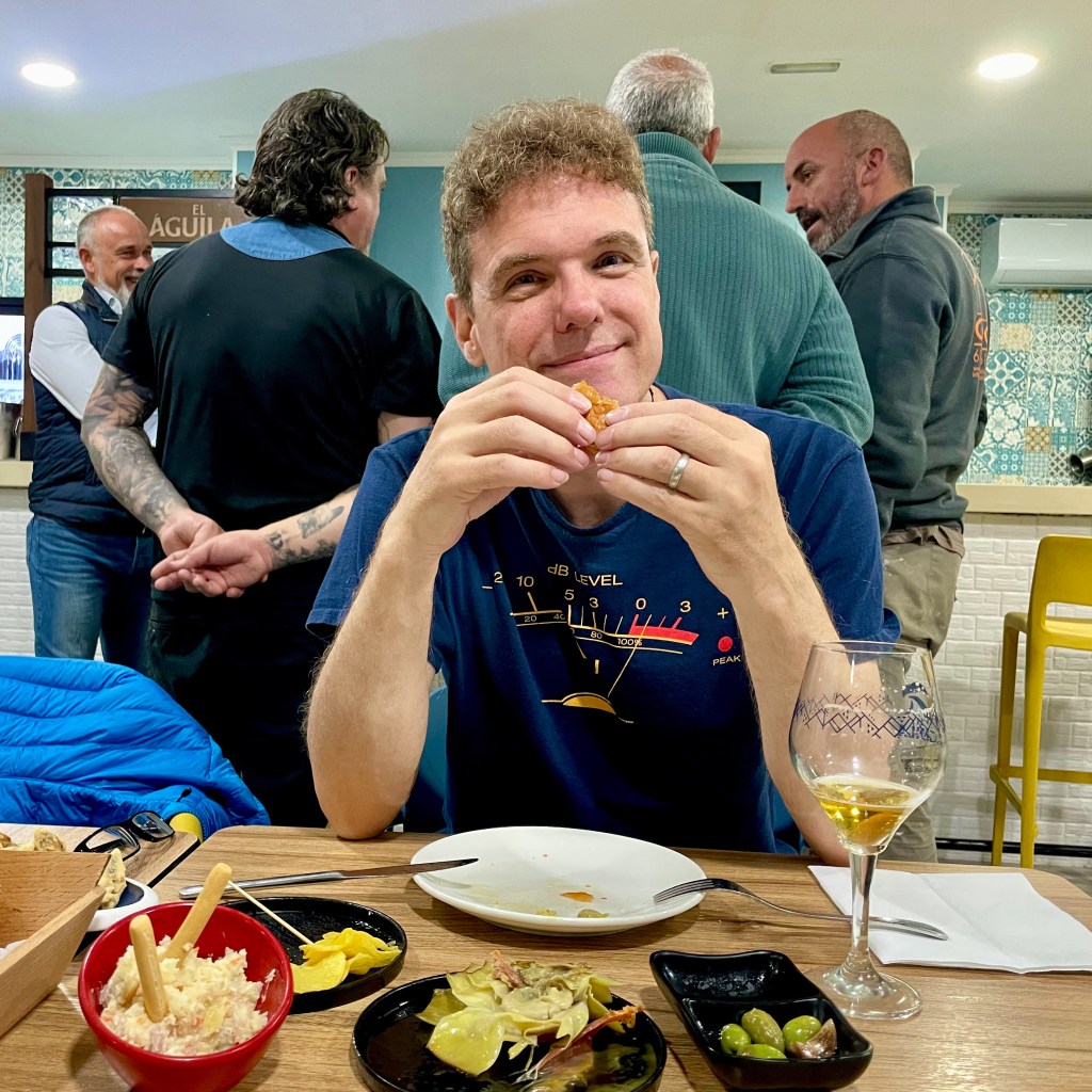 K’s developing a chesty cough so I check the Spanish for ‘cough’ and we drop by a pharmacy for some cough syrup. Then we wander Estepona town centre and the waterfront one last time until it’s late enough to present ourselves at El Patio for our final meal on the Costa del Sol. We’re almost the only customers at first, but the locals soon show up. Within half an hour it’s buzzing. Four boisterous but good-humoured blokes come in and stand at the bar behind me all talking at once at a volume that any self-respecting Cantonese speaker would be proud of: