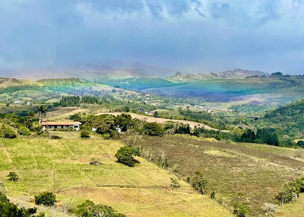 Halfway to San José, the winding road climbs into low cloud. For some time, vehicles coming towards us are little more than a pair of fuzzy headlights. Then we crest and descend back into the sunshine of Costa Rica’s central valley. At a rest stop, a band of refracted light hangs over the hills just below the clouds: