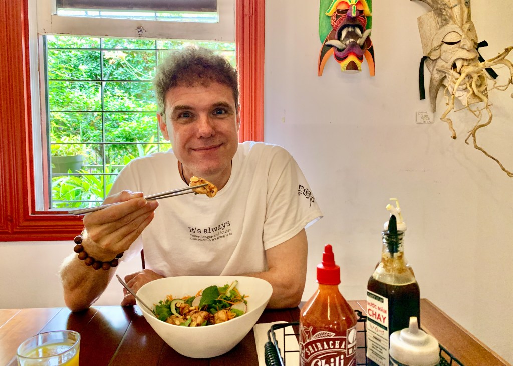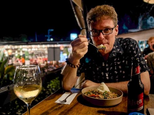 On our fourth evening, we finally venture out for dinner to a Thai place overlooking the jungle. It’s a hot night and I wish I’d stuck with shorts instead of attempting to look dapper in long trousers. The food is excellent, but the restaurants here call for deep pockets. And unlike everywhere we’ve eaten in Costa Rica until now, the already steep menu prices don’t include tax and service.