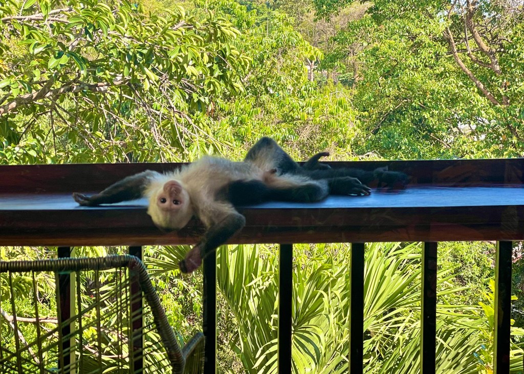 We’ve treated ourselves in Manuel Antonio. Our home for the next ten days is a small house built on an incline, with a veranda out back looking over the jungle. Within minutes of arriving, the local monkeys arrive to check us out. We’re stretching our budget here, but I could get used to a life like this. Sitting with a cup of tea, two macaws screech by in a riot of red and blue feathers. Bird chatter aside, the neighbourhood is quiet, the veranda shaded, and the view magnificent. No volcano, though.