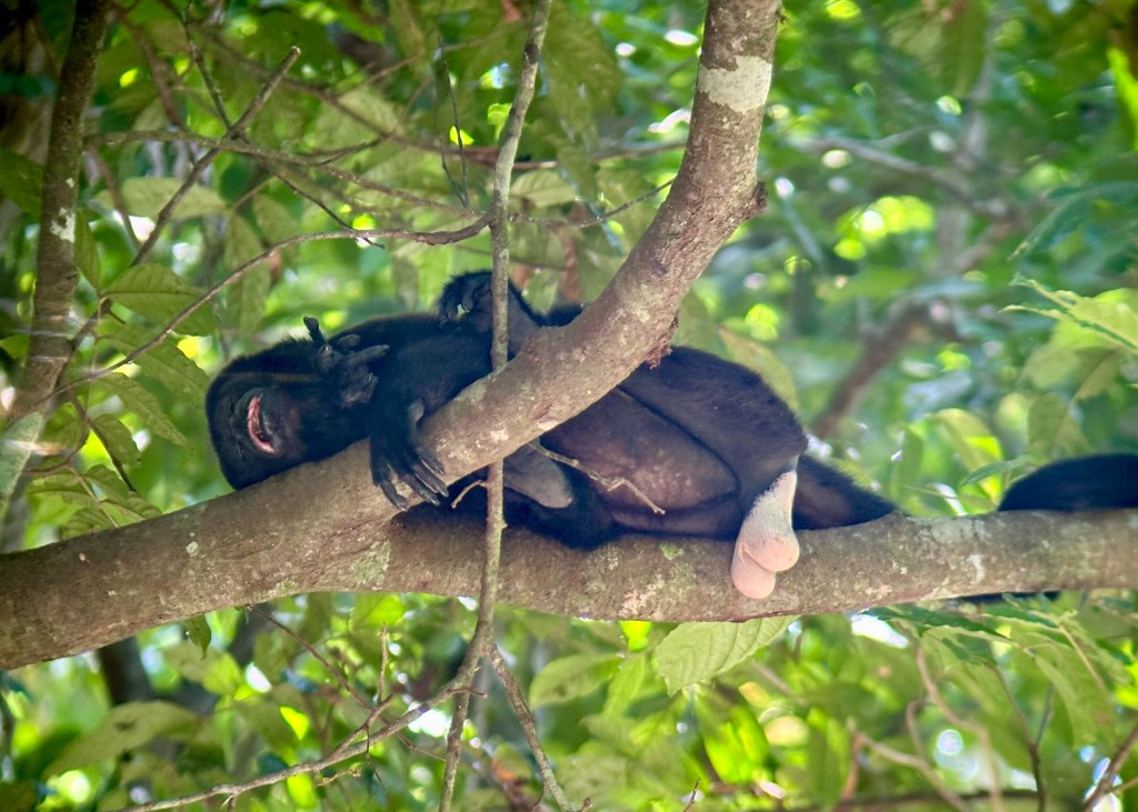 Given the space the wildlife has to roam in, it’s surprising how much chooses to hang out within sight of us tourists. But it’s not easy to spot. Fortunately, our guide Francisco was born with bionic vision and can see animals that no human eye can spot. Most of us are here above all to gawp at sloths and monkeys, but Francisco finds plenty more wildlife to train his telescope on: bats, hummingbirds, crabs, butterflies, and lizards among them. Sloths are elusive: we spot two, both fast asleep high in the canopy, their faces obscured by foliage. We must have been especially lucky sloth spotting in La Fortuna. The monkeys — capuchin, howler and squirrel — are more obliging. Capuchins chase each other through the canopy, while this howler lounges with little sense of modesty: