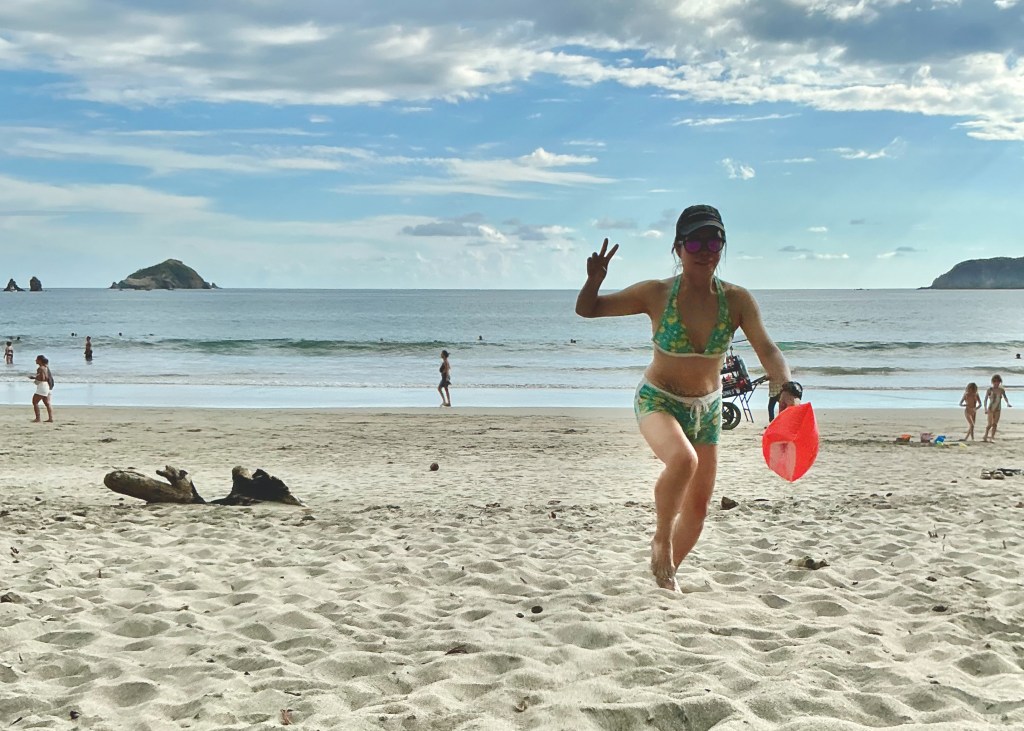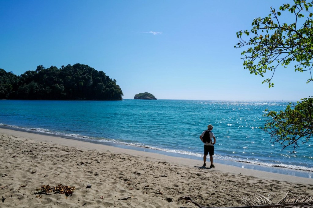 This afternoon, we head for “calm and peaceful” Playa Biesanz, a small cove promising a contrast to the long, straight stretch of Manuel Antonio beach. The two-and-a-half kilometre walk should be simple enough, but it’s hot. The newly asphalted road surface is almost black and sucks up the tropical heat. There’s little shade. K is struggling, and I’m concerned she’ll collapse from the heat before we reach the beach. Turning back isn’t realistic: we’re already closer to the beach than the village. She’s already wearing a hat but also wraps a towel around her head and takes it one pace at a time.