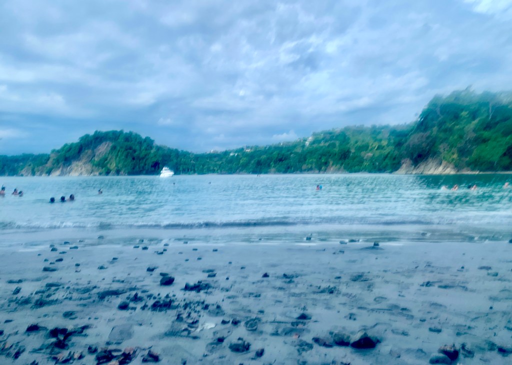 A final afternoon on Manuel Antonio beach, enjoying the tropical Pacific. Our bags would likely be fine left unattended on the beach, but we’re taking no chances as I’ve packed my iPad. K goes for the first splash in the rolling surf, while I keep watch. Then we swap. I mostly float on my back marvelling at the dense jungle that presses right up to the beach. Shortly before sunset, we trudge back up to the village. We won’t be swimming in salt water again until we reach Vietnam in September — and then only if the rainy season allows.