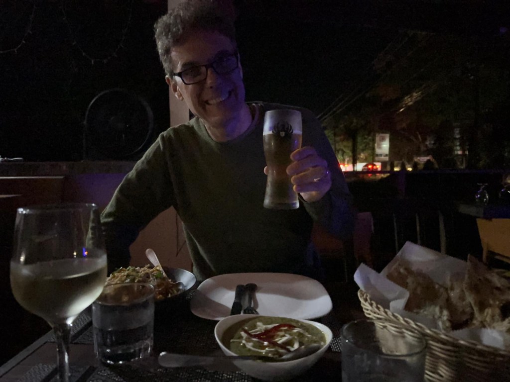 We’re in the middle of our meal when the lights come back on. Everyone cheers. I can finally see my chicken biriyani. A text from our Airbnb host explains that a tree fell on the electricity line serving the village, which accounts for the small explosion I spotted. Civilisation returns, but Tarzan would surely have approved of the brief return to nature.