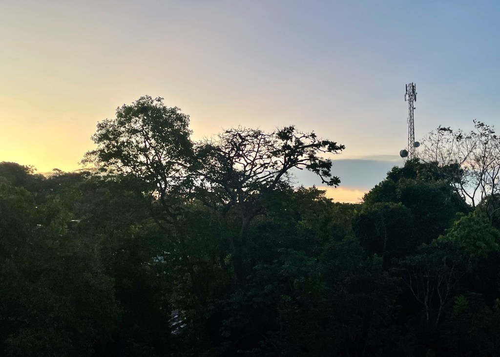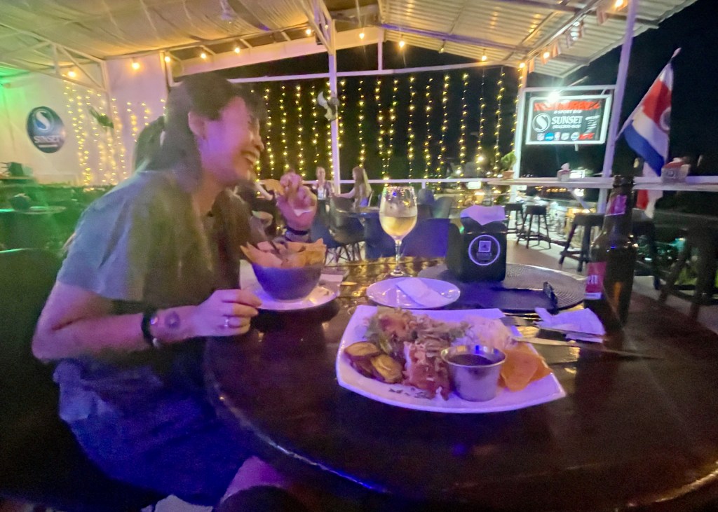 I finish some work at sunset. We slip downstairs to the hotel’s viewing platform, where we perch on rocking chairs watching dusk fall on Costa Rica for the final time. Uber Eats proves less successful tonight. The dumplings and sui mai that arrive are barely edible, leaving us thankful for the enormous lunch we had earlier.