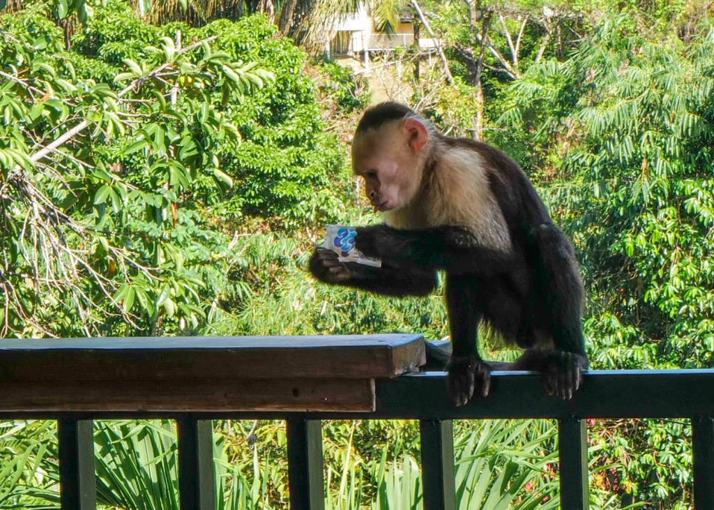As we’re finishing lunch, a lurching shape catches my eye below the kitchen window. I look up just in time to see a capuchin monkey making off with a packet of sugar. In a flash, he’s out the back door. He rips the sugar open, spilling most of it before cramming what’s left into his mouth. He must have crept in through the open back door, crossed the hob, shifted the tub of loose sugar from on top of the one containing the sugar packets, lifted the lid, and pulled one out before I spotted the delinquent little hoodlum.