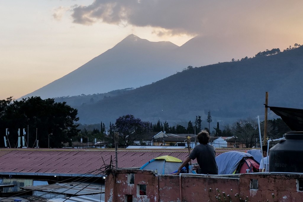 Tomas takes us up to the roof terrace, pointing out the three volcanos that loom over the town. As we watch, Volcan de Fuego — currently disrupting flights into Guatemala from North America — obliges with a puff of gas and ash from its distant cone. We’re safe from an unlikely major eruption here, but in 2018, in a town at its foot, 159 people lost their lives in an eruption that left Antigua under a thick blanket of ash.