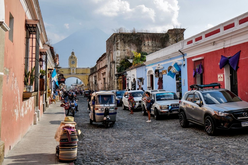 Guatemala City looks every bit as unglamorous as its reputation as we pass through its relentlessly scruffy suburbs of salvage yards and tangled overhead wires. Eventually they give way to forested hills, through which the dual-carriageway winds until we turn off directly onto the narrowed cobbled streets of Antigua.