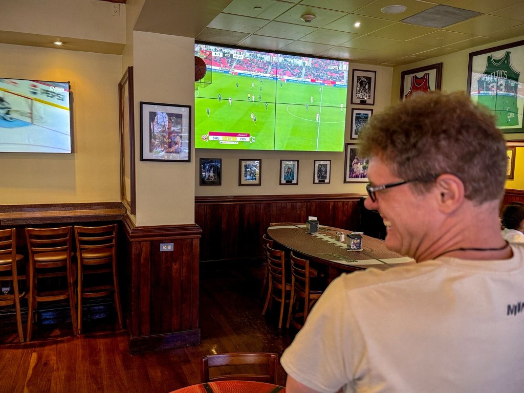 Hotel Barceló’s breakfast buffet is a cosmopolitan affair of international faces. How many of them are here, like us, for a single night before they get out of Dodge City, I wonder? Our ride isn’t due until two, so we while away the morning, check out at the last possible moment, and revisit Strikers sports bar for a lunch of chicken soup and refreshing cimarrona. Improbably, the TV is showing a rerun of Stoke’s match against Oxford United earlier this week: