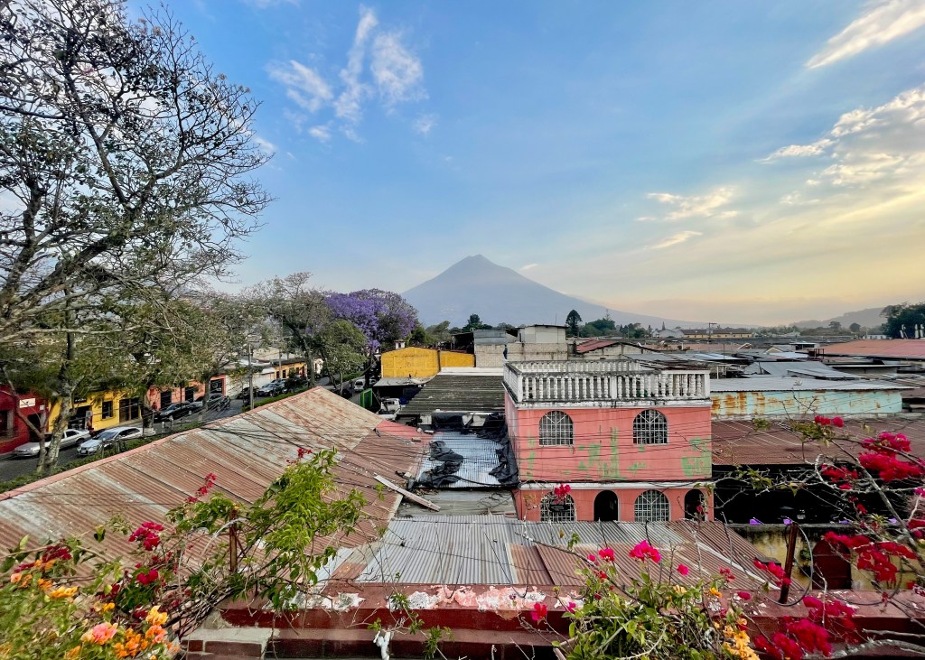Our penultimate day in Antigua. The wind’s picked up and blown away the smog that’s hovered over the town for a week. Finally, the sharp outlines of volcanos are visible again against a bright blue sky: