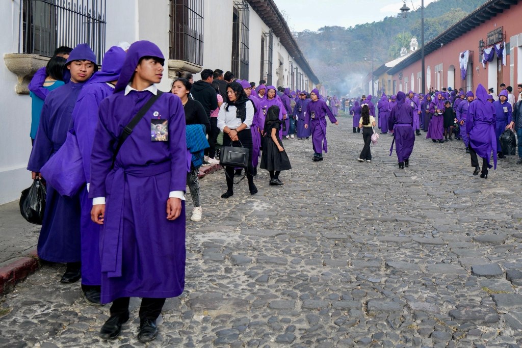 We’ve arrived in Antigua at the perfect time. Our host Tomas has alerted us to a Lent procession this afternoon. With the cobbled streets closed to traffic, we’re free to wander as we please in the middle of the road. Occasionally, someone passes in a flourish of bright purple robes. It’s unclear l if they’re lost or just running errands before the show.